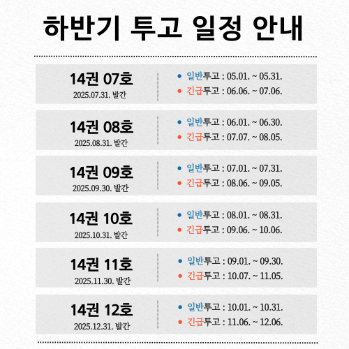 [제14권 제12호] 1. 원고접수 마감일: 일반 2025년 10월 31일, 긴급 2025년 12월 06일 2. 발행예정일: 일반 2025년 12월 31일 3. 논문투고 홈페이지 : http://submission.kscs.kr/ 4. 저자 모두 회원가입이 완료되어야 하며, 심사료 입금 확인 후 심사가 진행됩니다. 감사합니다.